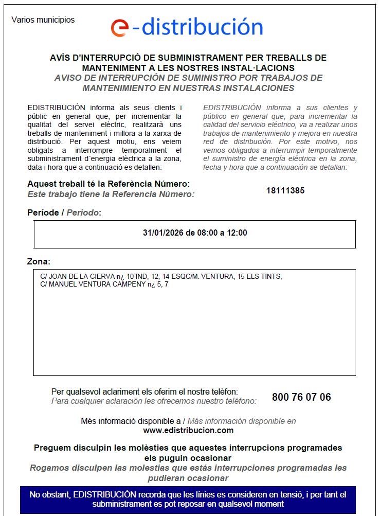 Aquest 31 de gener, EDISTRIBUCIÓN realitzarà treballs de manteniment i millora a la xarxa de distribució a diversos punts del municipi.