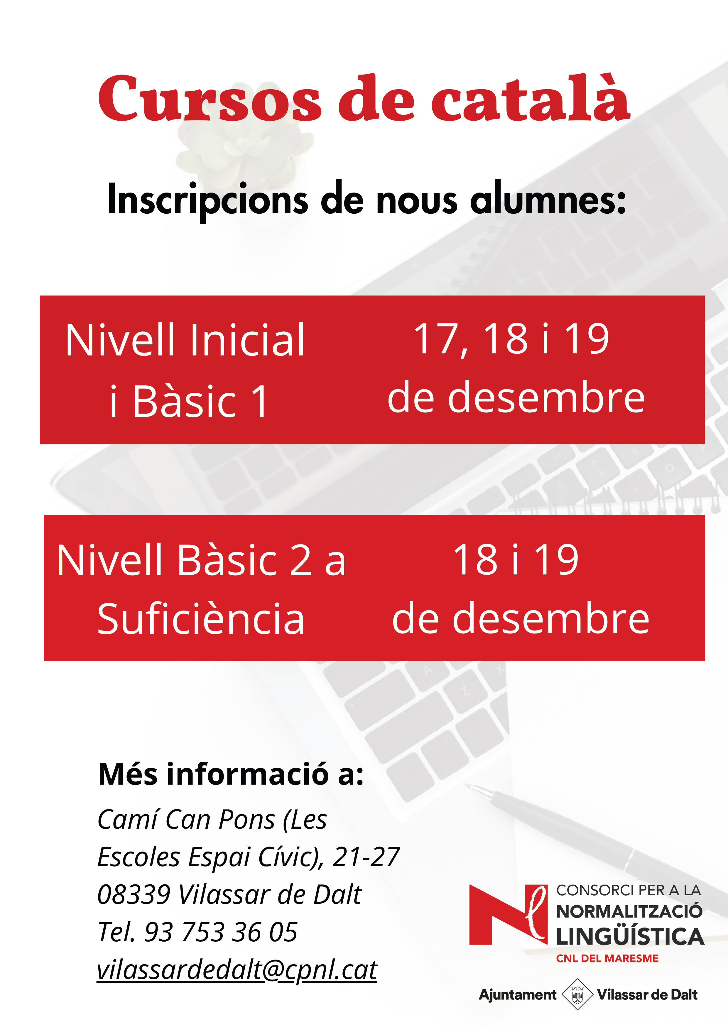 La setmana que ve s'obren les inscripcions pels nous cursos de català que ofereix el Consorci per a la normalització lingüística a Vilassar de Dalt. A partir del 16 de desembre s'hi poden inscriure les persones que durant els últims 12 mesos han completat un curs o n'han tramitat la baixa; i a partir del dia 17, la resta d'alumnes.
