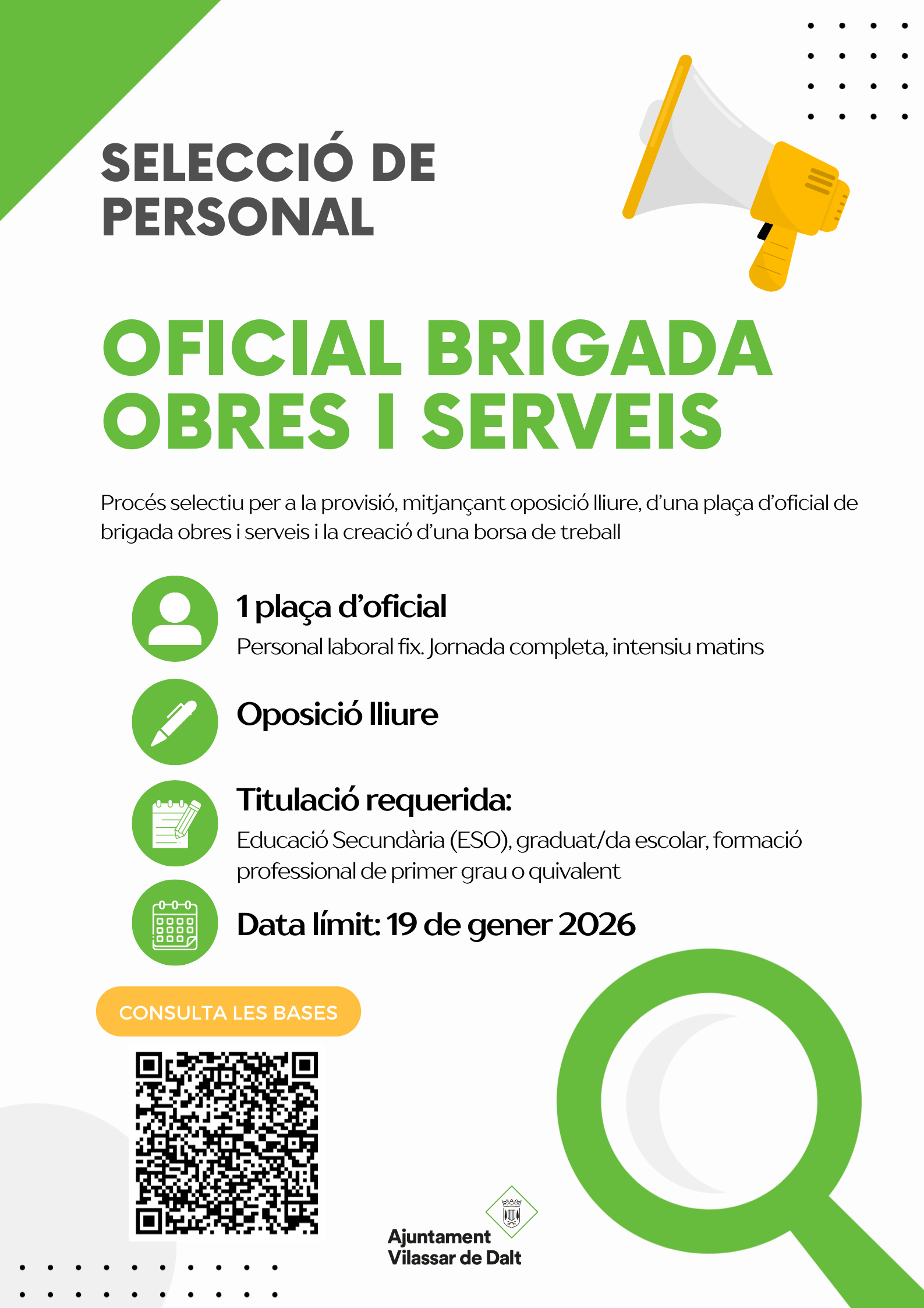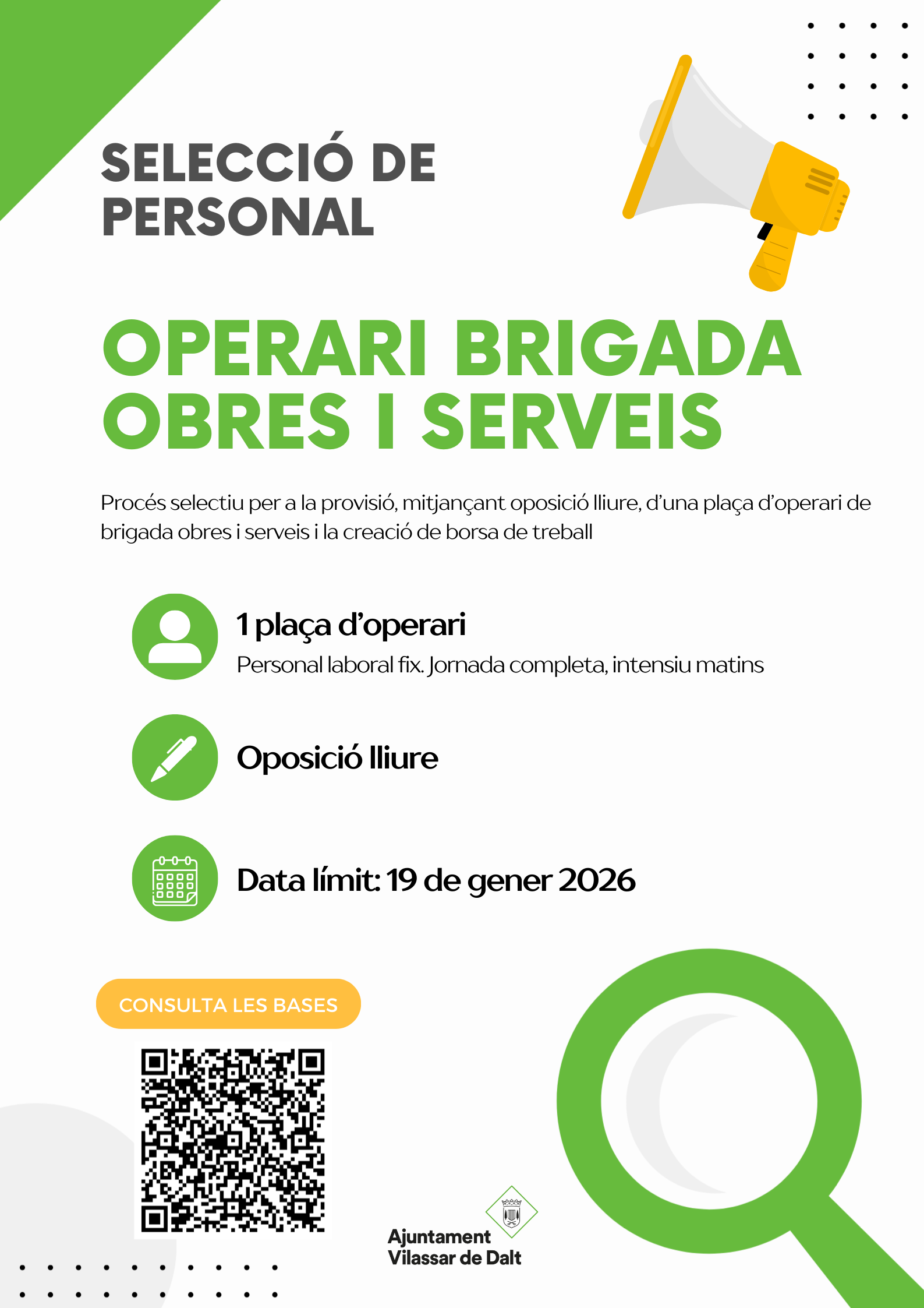 Ja s'han publicat les bases dels processos selectius per cobrir, mitjançant oposició lliure, una plaça d'oficial i una altra d'operari de brigada d'obres i serveis, vacants a la plantilla de personal laboral.
