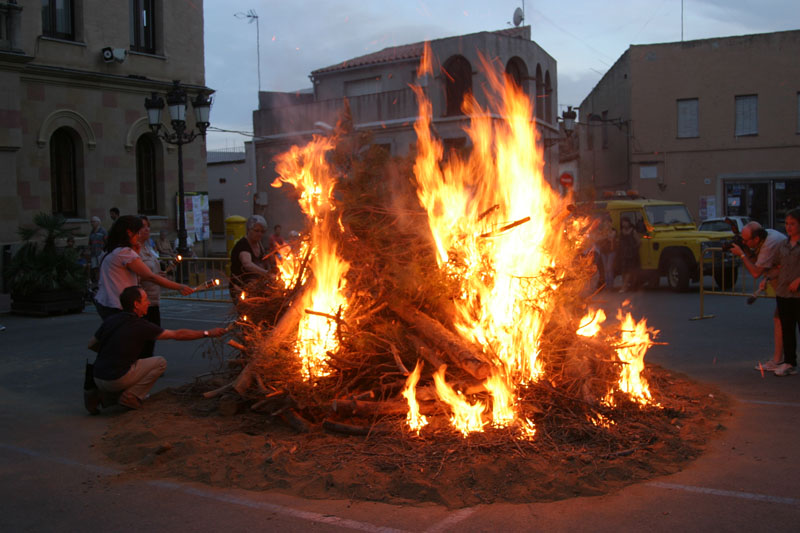 Sant Joan 2012Tal i com mana la tradició, la flama arribada des de la Muntanya del Canigó va encendre, aquest dissabte 23 de juny, la foguera de Sant Joan que presidia la Plaça de la Vila.