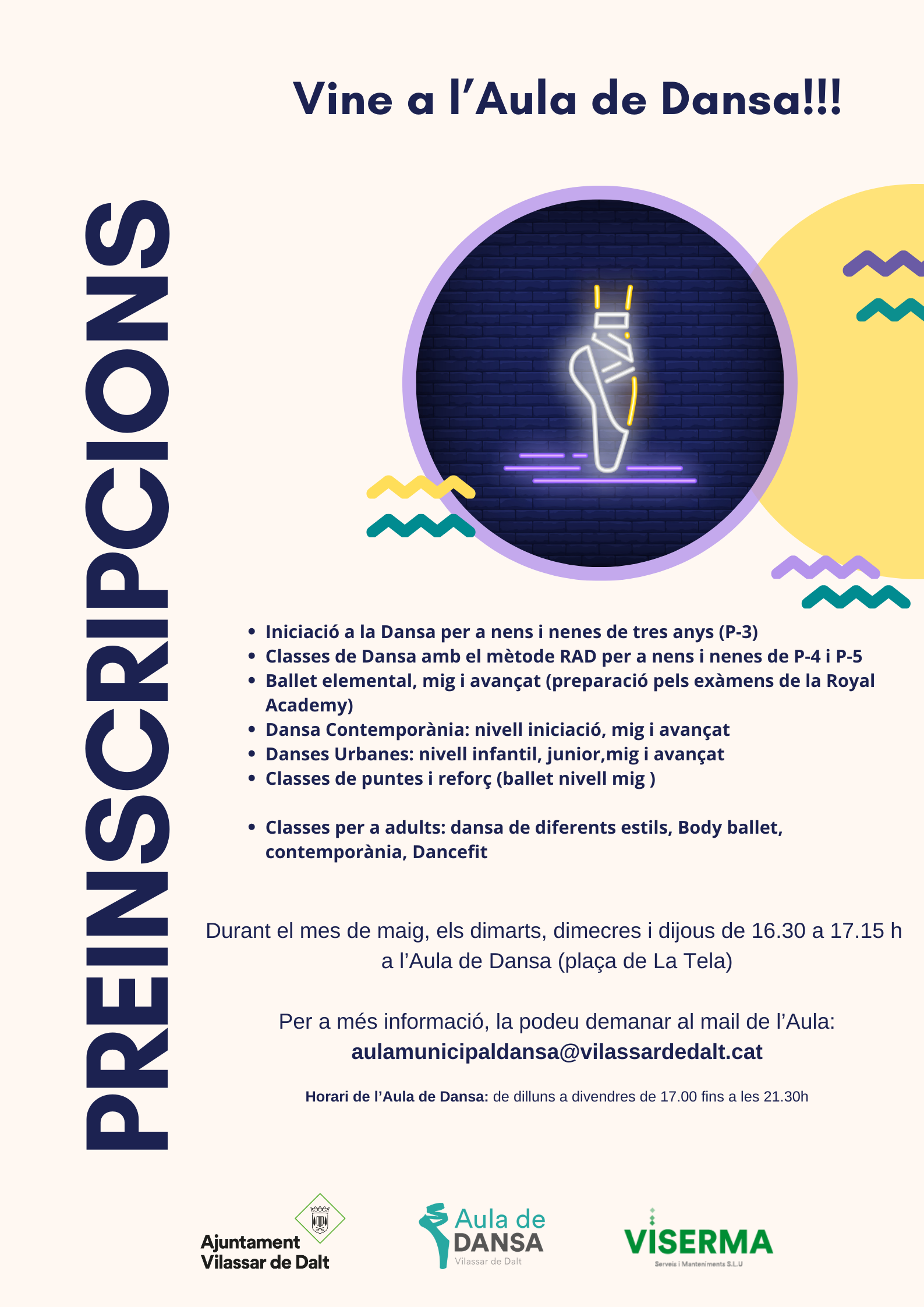 Podeu formalitzar les preinscripcions i demanar més informació els dimarts i dijous de 16.30 h a 17.15 h. durant el mes de maig a l’Aula de Dansa (plaça de La Tela).