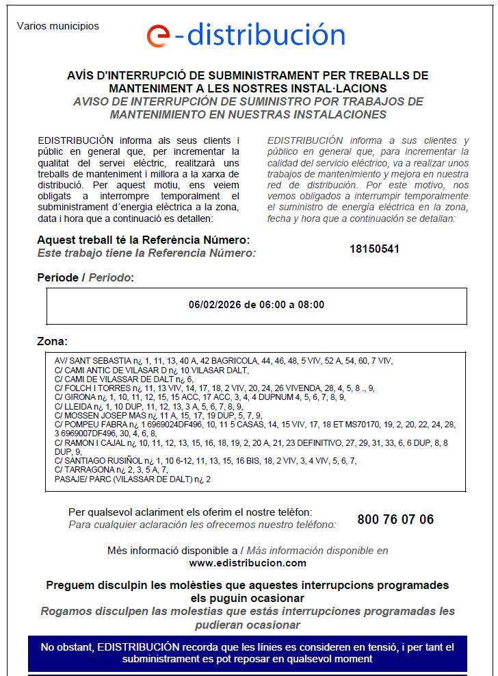 AVÍS: Interrupció del subministrament elèctric