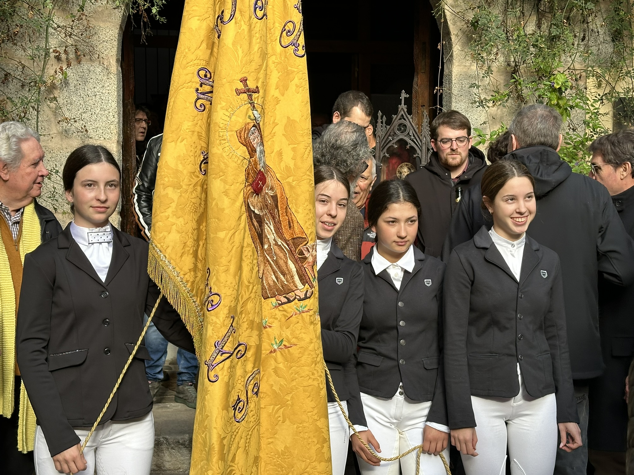 A mig matí, la comitiva de la festa s'obria camí fins a Cal Traginer, al carrer Nou, 22, on hi havia guardada la bandera que enguany ha portat la Victòria Bosch Pons, acompanyada de la capitana de bandera, la Daniela Bosch Pons, i les cordonistes, la Íngrid Múrcia Planas i la Kosara Colomer Núñez. Tot seguit, la comitiva es va dirigir a l'església on Mossèn Joan Pablo Calvo Calvo va celebrar l'Ofici Solemne amb el suport del vicari Antoni Vidal i Gómez del Moral i amb l'acompanyament musical de La Principal de la Bisbal.