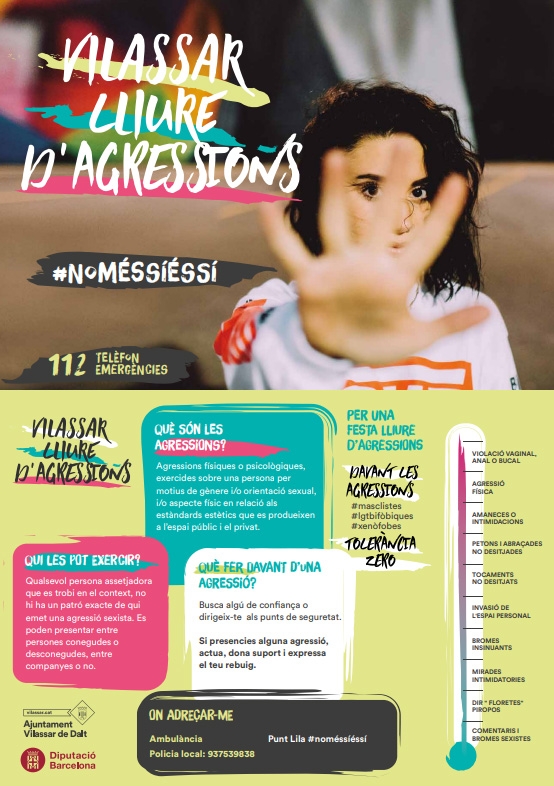 A Vilassar de Dalt volem espais lliures d’agressions i no tolerarem cap tipus de violència masclista, sexista, racista, homòfoba, lesbofoba, trànsfoba, ni cap mena d’agressió. Volem que els espais d’oci i de festa siguin espais segurs i igualitaris. Si veus o pateixes una agressió, dirigeix-te a la carpa del Punt Lila, on acolliran la persona agredida i activaran el protocol si ho demana.
